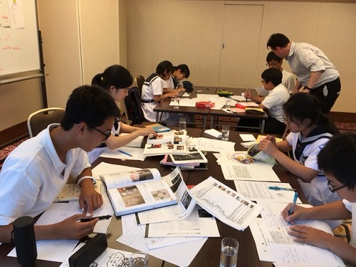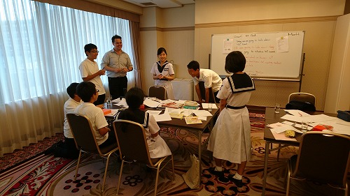 GLAコースは、ホテルでイングリッシュ・キャンプの1日目。ベルリッツのMatt先生による、楽しい英語レッスン。Matt先生への質問を英語で考え、その回答をヒントに自分達の自己紹介を英語で行いました。その後は調べ学習を英訳し、プレゼンテーションの原稿作り。疲れだ頃にはゲームを織り交ぜながらでも、楽しく過ごせました。
