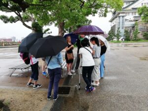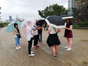 国際文化科1年生が大阪城公園周辺でフィールドワークを行いました。あいにくの雨模様でしたが、大阪城へと向かう外国人観光客はたくさんいて、生徒たちがあらかじめ考えていった様々な質問に快く答えてくれました。生徒たちも、自分たちから英語で話しかけていってコミュニケーションが取れたことで、自信をつけた様子でした。