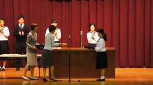 慎重な審議の結果、栄えある金賞は、高3F生田萌唯さんが受賞しました。銀賞は二人で、高3E鮫島さんと高3F佐伯さん。銅賞は高2F常友さん、高2G大倉君、高2H窪田さん、高2J安田さん、高3B西原さんという結果になりました。色々な視点からテーマに対するアプローチがあり、聴いている生徒たちも良い刺激を受けたことでしょう。皆さま、ご苦労様でした