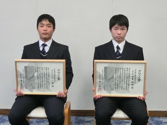 中学 高校 女子レスリング マロニエ賞 受賞 2019.01.07 12月25日(火)兵庫県公館にてマロニエ賞の表彰式が行われました。マロニエ賞は、スポーツ・文化等で優秀な成績をあげ、兵庫県私立学校に在籍している生徒に対し、県知事から表彰するものです。本校生4名が授与しました。 レスリング部 中学2年 小幡未羽レスリング部 中学2年 原田 渚ボクシング部 高校2年 由良謙神ボクシング部 高校3年 穴口一輝