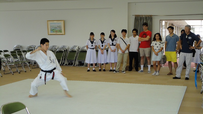 まずは、本校国際文化科の生徒たちの案内で、校内見学とクラブ見学へ。空手道部の型やダンス部の作品を見学したときには、とても感心した様子で、部員たちとも元気に交流していました。