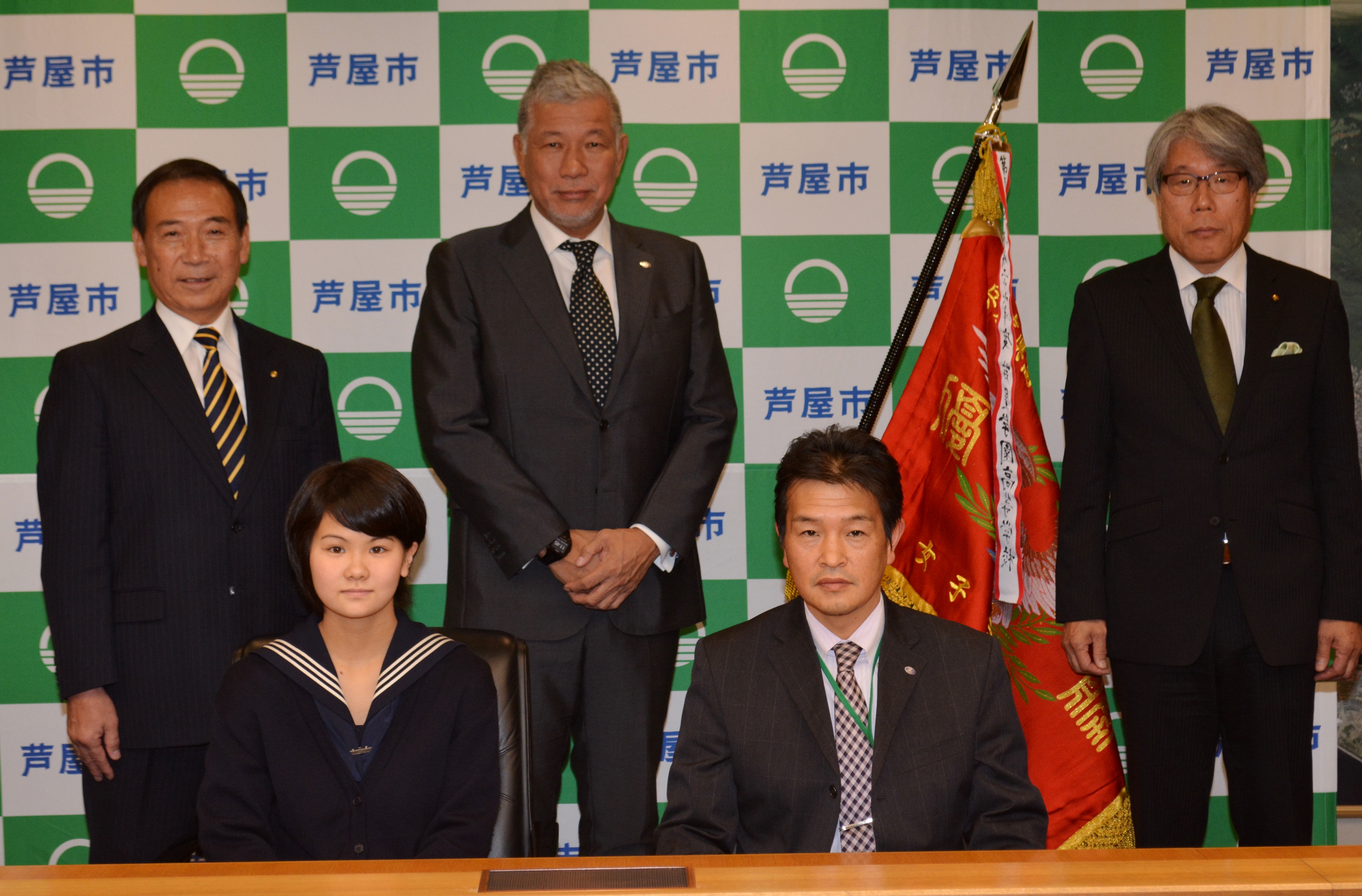 女子卓球部・ダンス部・サッカー部の代表の生徒と顧問・監督、大八木淳史校長、奈良垣実教頭が芦屋市役所に山中健市長と福岡憲助教育長を表敬訪問しました。下記の通り各クラブともそれぞれ直近の大会で素晴らしい成績を収め、その報告のための訪問です。