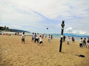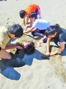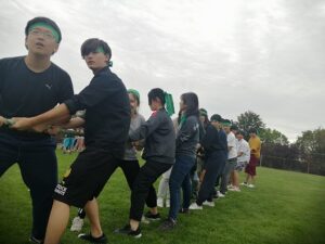 今日はsports dayで、チーム対抗でポイントを競い合いました。まず始めにチーム毎に考えた応援合戦です。応援もポイントに含まれるので、各チーム構成を真剣に考えていました。応援合戦でテンションを上げたあとは、いよいよ競技開始です。日本でもお馴染みの綱引きや障害物競争はもちろん、2人ペアで水風船を投げ合い、誰が割らずに1番長くパスできるか競い合う競争など、初めて体験する競技に生徒たちは大盛り上がりでした。