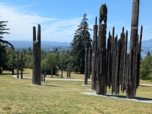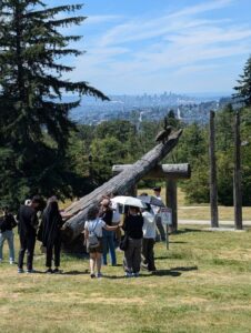 ホストが持たせてくれたランチバッグを手に登校。3週間お世話になる先生方やボランティアの人たちと出会いました。同じ期間勉強することになるメキシコの生徒たちと一緒に開校式をした後、英語力をはかるテストを受けました。先生とマンツーマンのスピーキングのテストもありました。午後のアクティビティでは近くのビーチやバーナビーマウンテンに行きました。山にはバーナビーの姉妹都市である釧路市から贈られたトーテムポールがありました。さらに山の上にある大学も見学して帰って来ましたが、陽射しがきつく暑かったです。