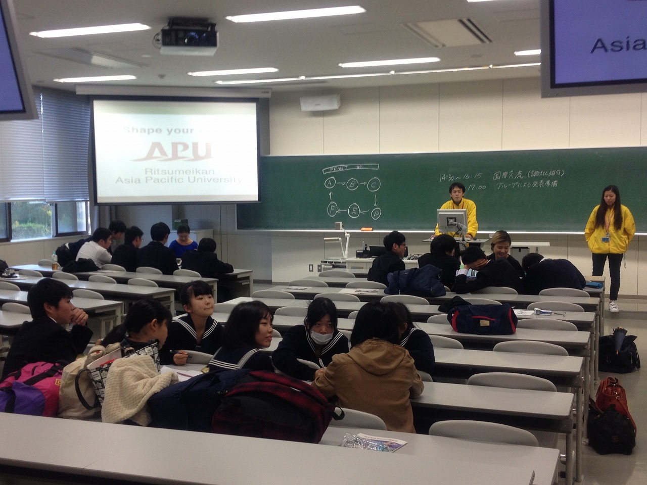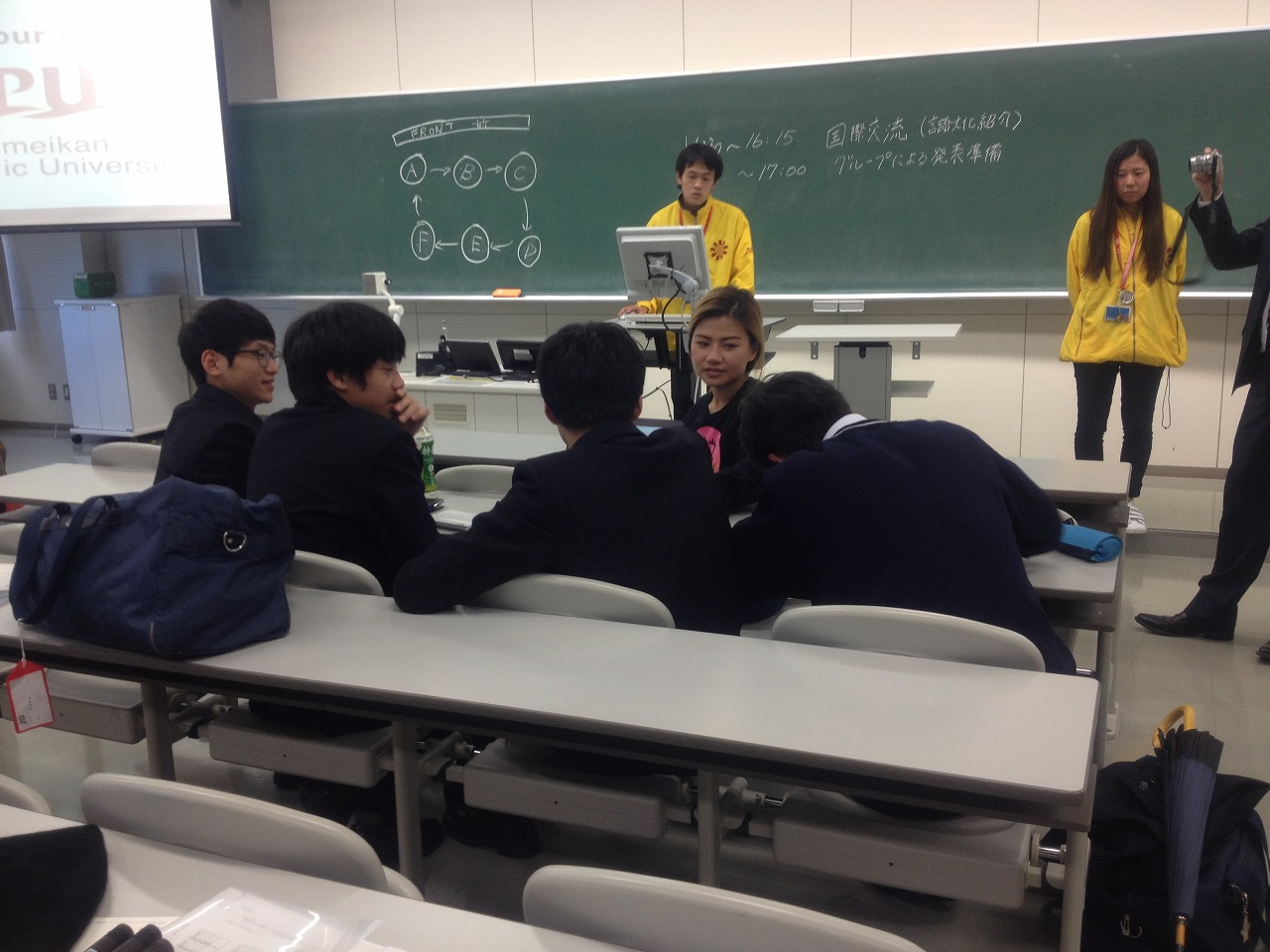 高校 Topics 国際文化科1年生APU研修旅行1日目 2016.11.01 朝早くに新大阪を出発し、新幹線、特急ソニックを乗り継いで別府市にある立命館アジア太平洋大学に到着しました。長旅の後でしたが、タイ、モンゴル、サモアなど6カ国の留学生に出身国のことを教えてもらっていると、興味深くてアッという間に時間が過ぎました。こちらからも色々と質問して、たくさんのことを学びました。今夜は、各班で学んだことをまとめ、明日の発表に備えます。