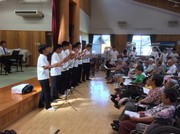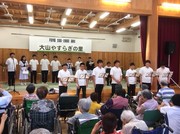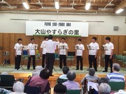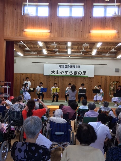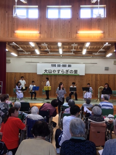 午後からは、大山合宿恒例となりました、大山やすらぎの里にての演奏を行いました。今年は合唱部と吹奏楽部が合同で演奏させていただき、たくさんのおじいちゃんとおばあちゃんに喜んでもらうことができました。生徒たちも大きな拍手をもらって、大満足の様子でした。