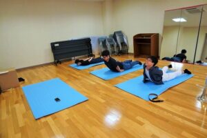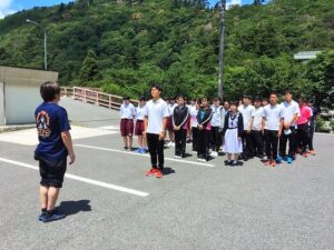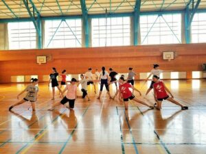 昨日は昼過ぎに宿舎に到着してから西小学校の体育館で練習をしました。プール終わりの小学生に見守られながら、筋トレや体幹トレーニングをした後、体育大会の演目を練習しました。暑い中、集中して部活動に取り組むことが出来ました。