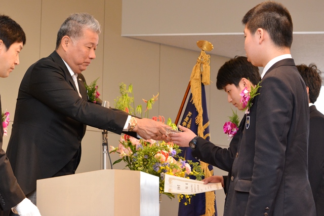 卒業生一人ひとりに大八木淳史校長から卒業証書が授与されたのに続き、校長式辞では「皆さんの義務教育は終了いたしました。これから始まる高校生活の3年間は人生で一番成長する時期です。この3年間に良い出会いをたくさん作ってください。」と力強いエールが送られました。来賓祝辞、皆勤賞の表彰と式は厳粛に進行し、卒業生代表による挨拶で中学校生活3年間の様々な思い出が語られたあと、最後の卒業記念の歌「卒業の唄~アリガトウは何度も言わせて~」合唱では感極まり涙のこぼれるシーンも見られ、感動の卒業証書授与式は幕を閉じました。
