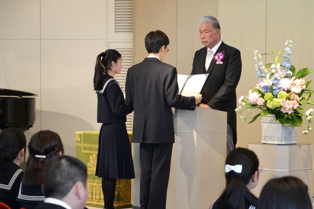 卒業生一人ひとりに大八木淳史校長から卒業証書が授与されたのに続き、校長式辞では「皆さんの義務教育は終了いたしました。これから始まる高校生活の3年間は人生で一番成長する時期です。この3年間に良い出会いをたくさん作ってください。」と力強いエールが送られました。来賓祝辞、皆勤賞の表彰と式は厳粛に進行し、卒業生代表による挨拶で中学校生活3年間の様々な思い出が語られたあと、最後の卒業記念の歌「♪3月9日」合唱では感極まり涙のこぼれるシーンも見られ、感動の卒業証書授与式は幕を閉じました。