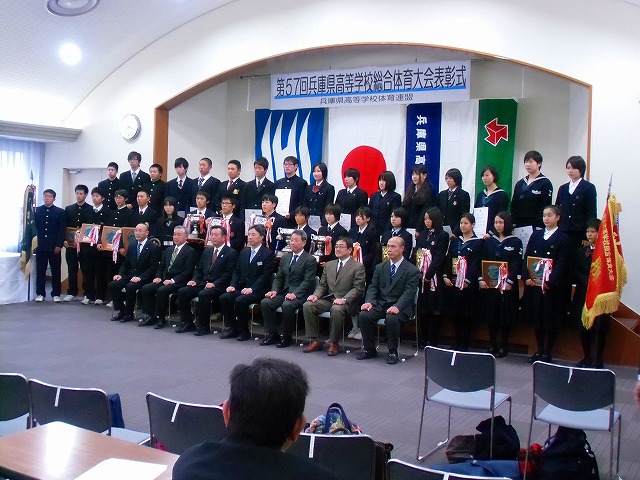 高校 平成25年度 兵庫県高等学校総合体育大会表彰式 2014.01.29 平成25年度第57回兵庫県高等学校総合体育大会表彰式が、1月26日午後3時より、神戸三宮にある兵庫県農業共済会館「大会議室」で行われました。芦屋学園高校は女子の部で第7位に入賞し、生徒会運動部長の小西さんと卓球部の中谷さんが代表として参加しました。