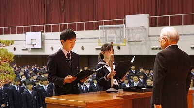 在校生代表の「歓迎の言葉」、新入生代表の瀧君、笠原さんの「誓いの言葉」があり、最後に校歌を斉唱しました。