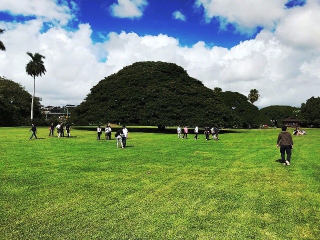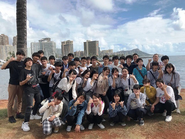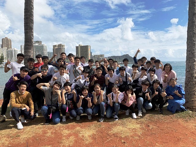 中学 高校 Topics 普通科高2修学旅行(ハワイ)だより 2018.12.01 11月30日 第1日目 全員元気にホノルルに到着しました。入国審査では外国へ来たことを実感しました。昼食は、アロハタワーでロコモコを食べ、モアナルアガーデン、イオラニ宮殿、カメハメハ大王像を見学しました。 今日は、少し疲れ気味なので、夕食をとって、早めに就寝します。明日は、朝からダイヤモンドヘッドトレッキングに挑戦です。