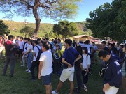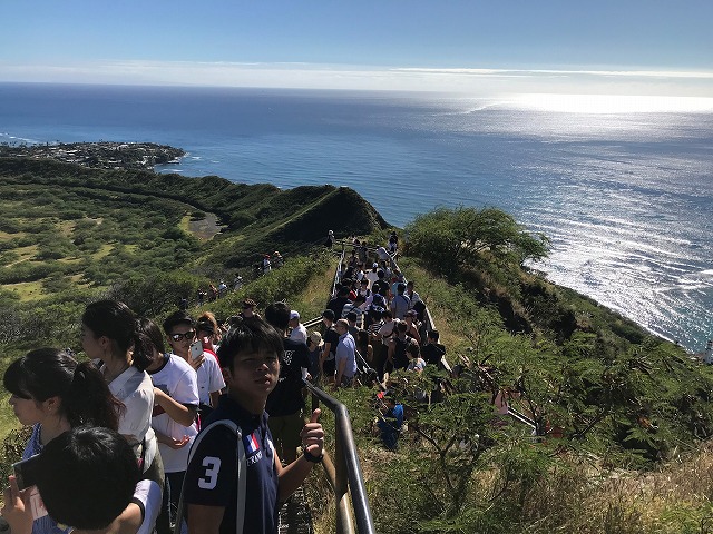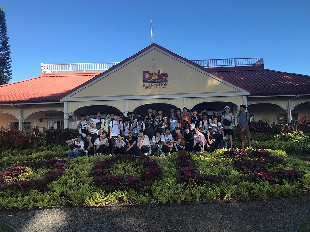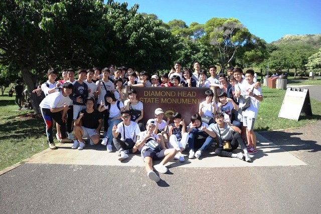 中学 高校 Topics 普通科高2修学旅行(ハワイ)だより2 2018.12.02 12月1日 第2日目アロハ~朝からダイヤモンドヘッドトレッキングで汗を流し、山頂からワイキキを一望しました。午後は、ハレイワタウンを散策し、その後、広大なパイナップル畑を見ながらドールプランテーションで記念写真を撮り、名物のパイナップルソフトを食べました。夕食は上品雰囲気の中マリヨットホテルでいただきました。明日は、パールハーバーで平和学習と、ワイキキ地区で班別自主研修です。