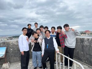その後の首里城見学では、6年前の火災からまもなく復興という本殿の様子も見られクラス写真撮影。