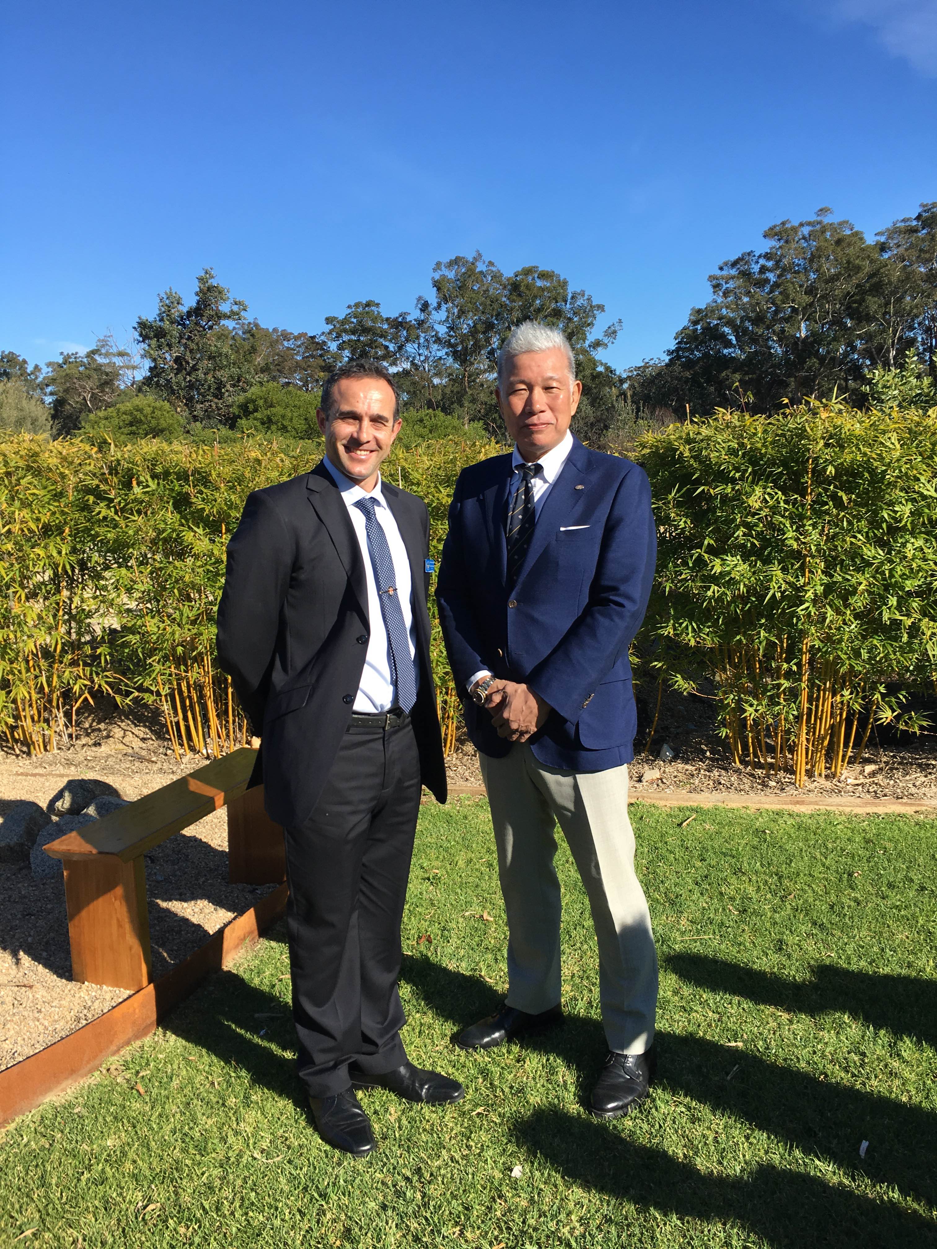 大八木校長先生がセントピーターズのヒンクスマン校長先生と対面し、交流プログラムに対する感謝や今後も良好な関係が維持されるよう親睦を深めました。