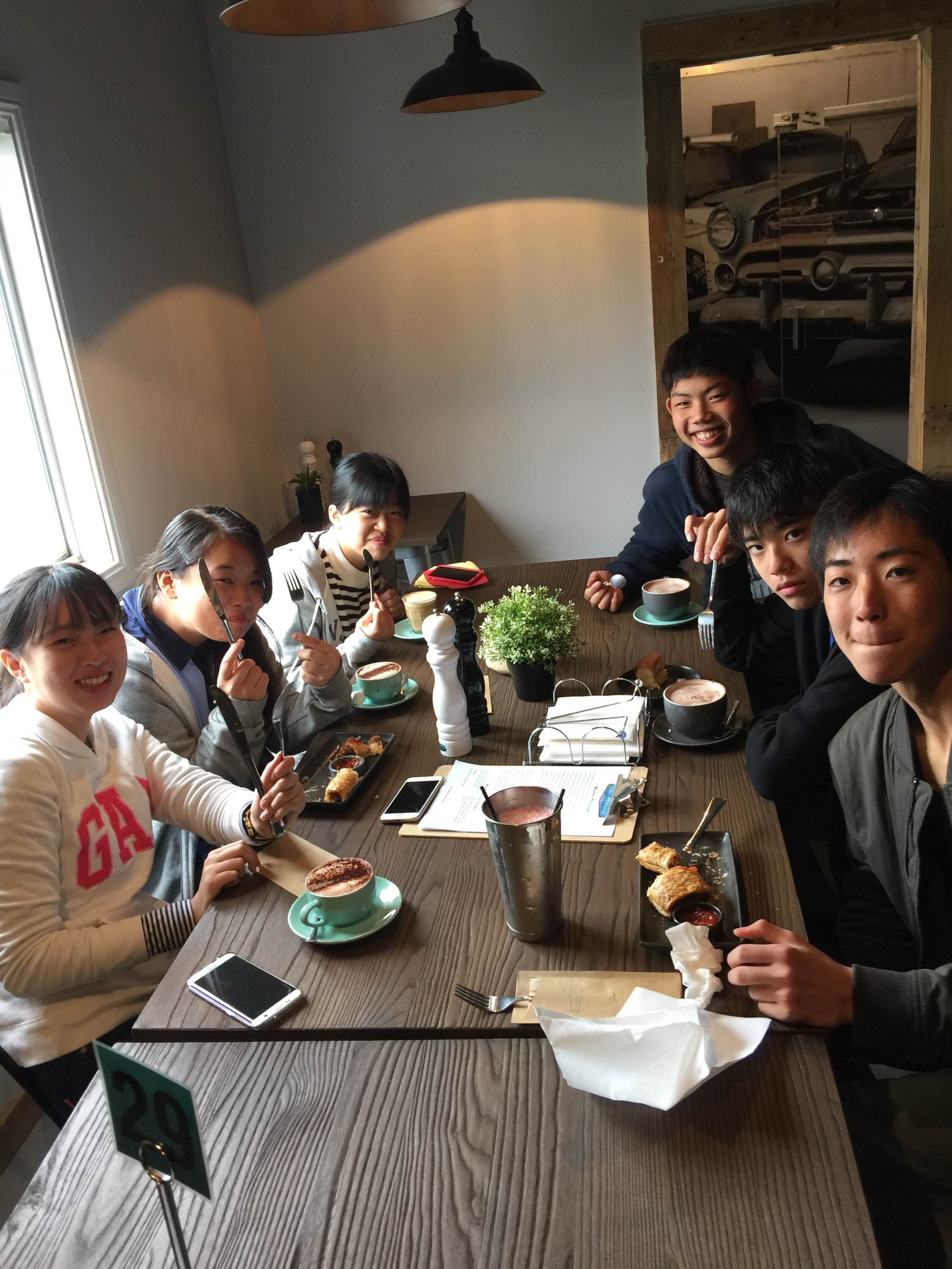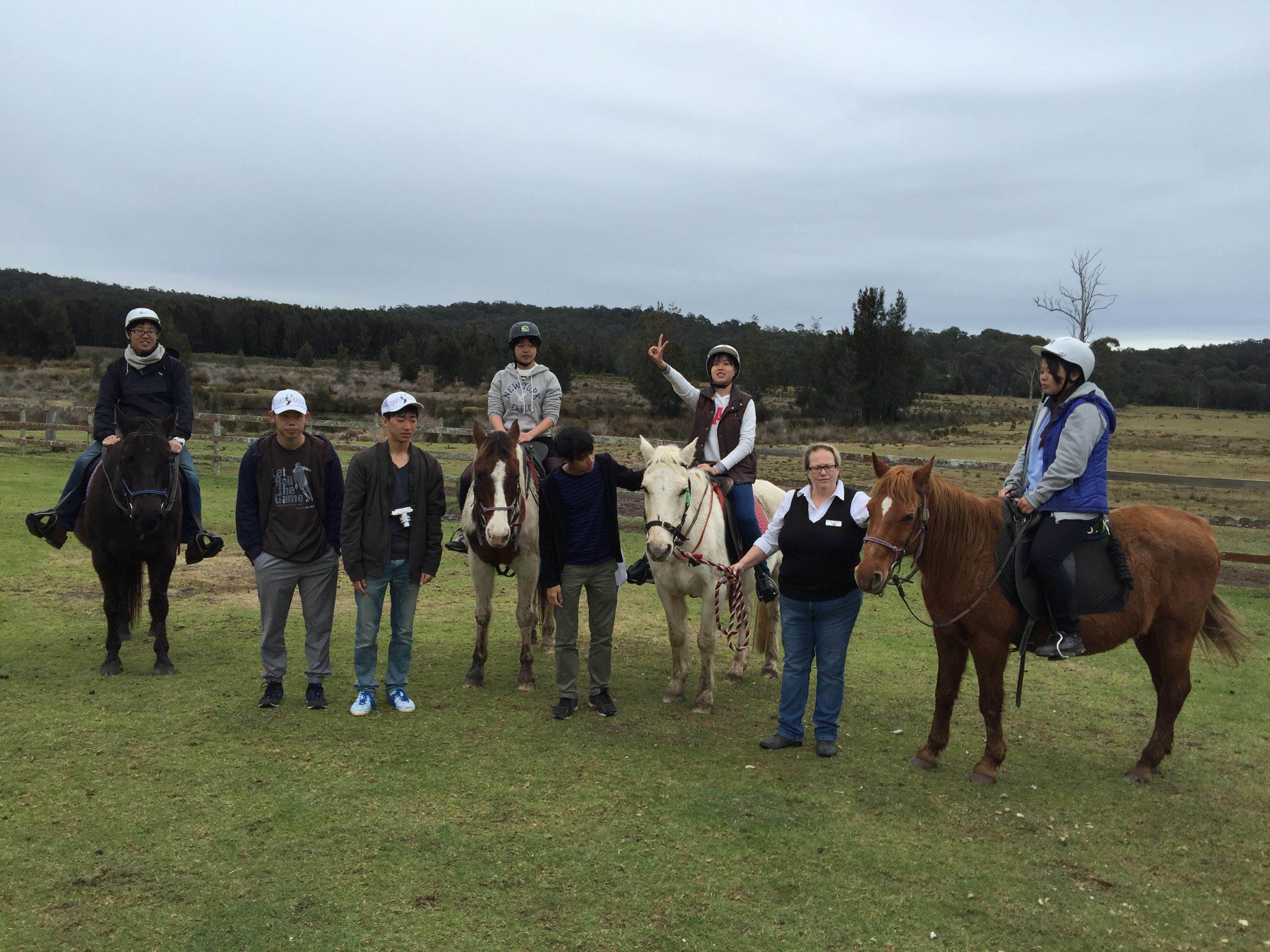 高校 Topics 海外提携校交流プログラム(セントピーターズ)だより その8 2016.08.04 10日目です。昨晩から今朝にかけてオーストラリアに来て初めて雨が降りました。今日は乗馬体験をしてきました。雨の影響で一時は中止も考えられましたが、なんとか持ち直したため実施することができました。 学校を出発してすぐに、近くのカフェでそれぞれコーヒーやソーセージロールなどを注文しました。その後、Oaks Ranchへ向かいました。そこで、それぞれ約30分ほど馬に乗り、あたりを散歩しました。 午後は学校に戻り、先週初めて教えに行った授業でもう一度カルタや折り紙などを教えました。