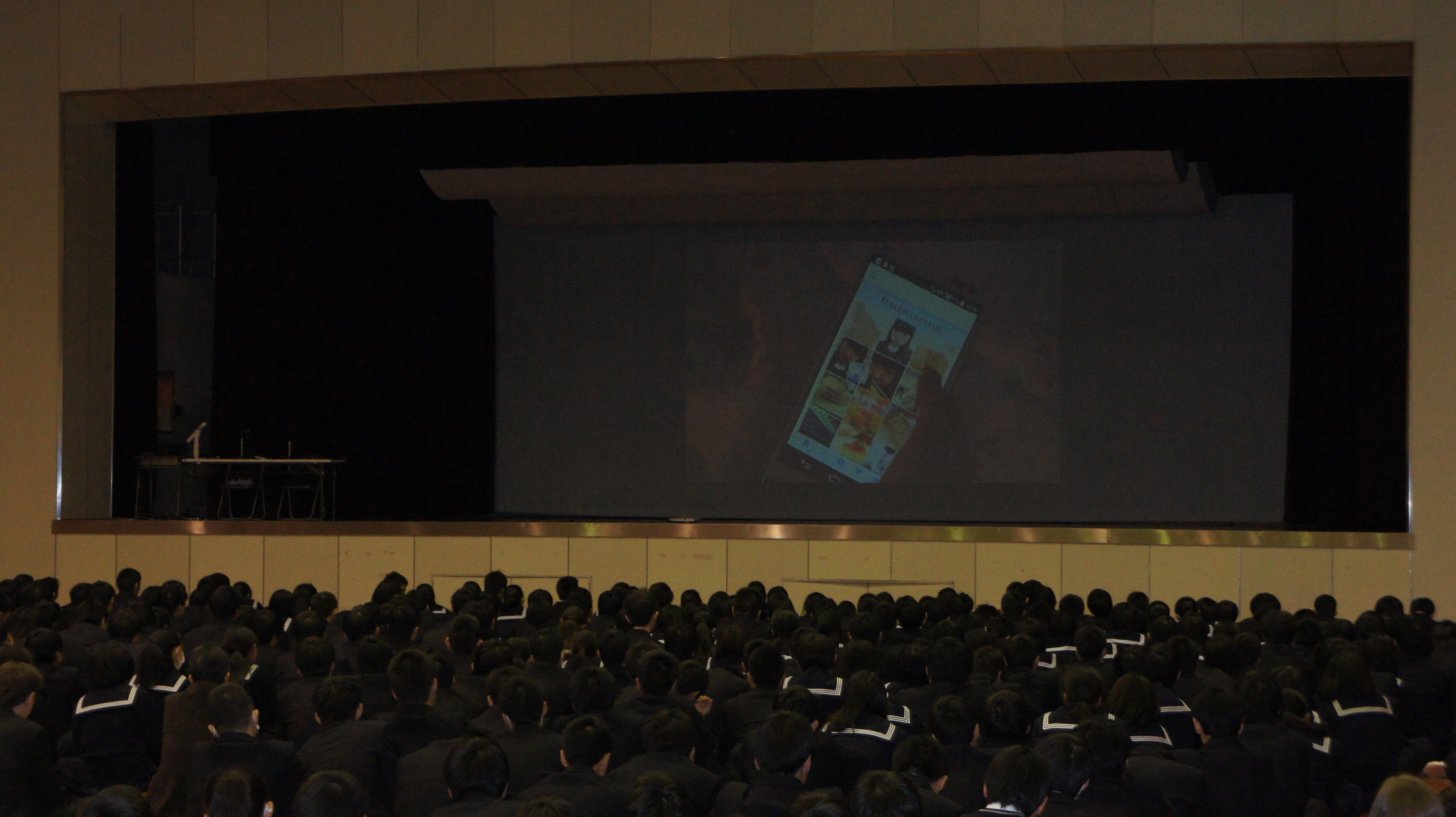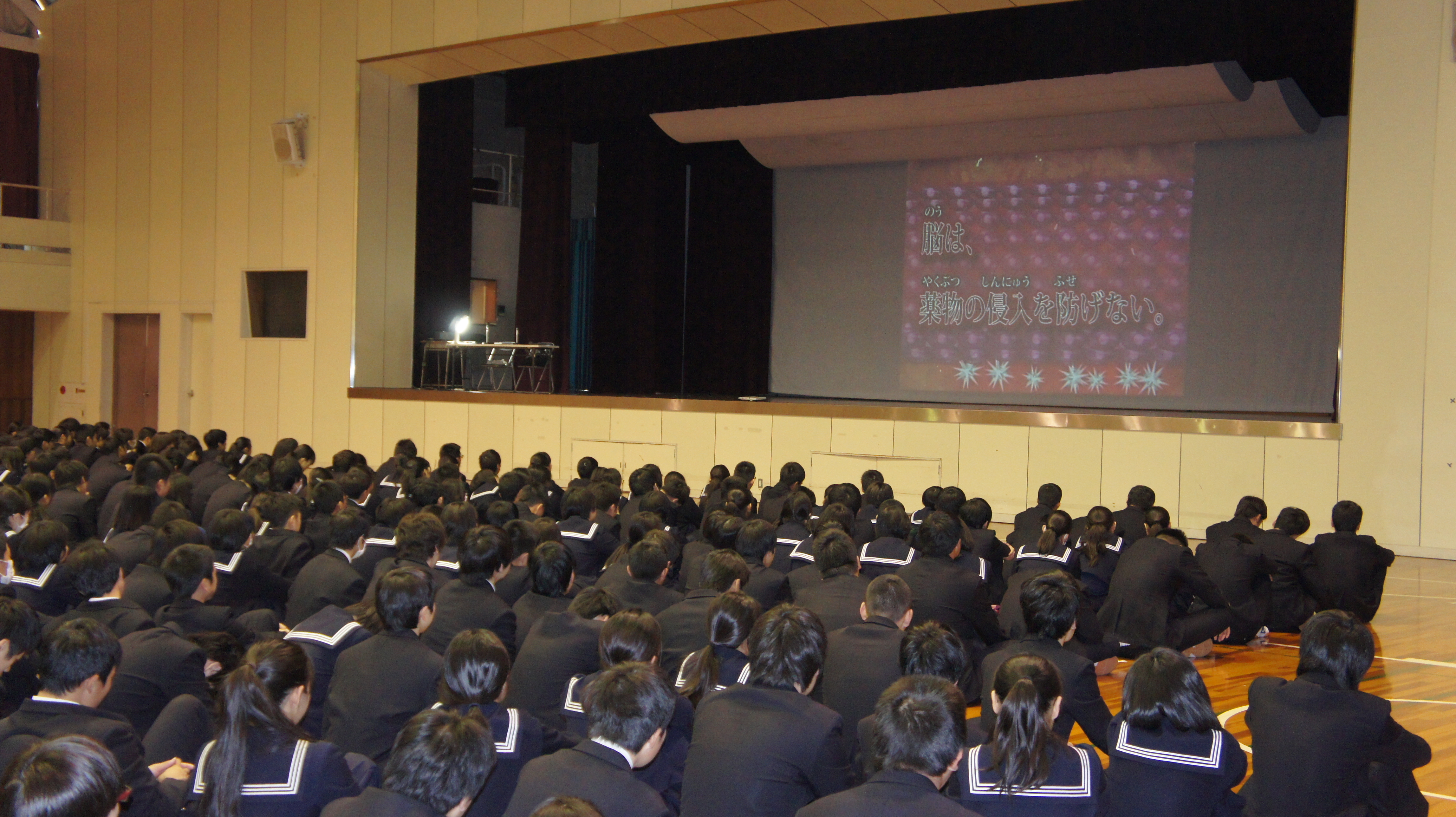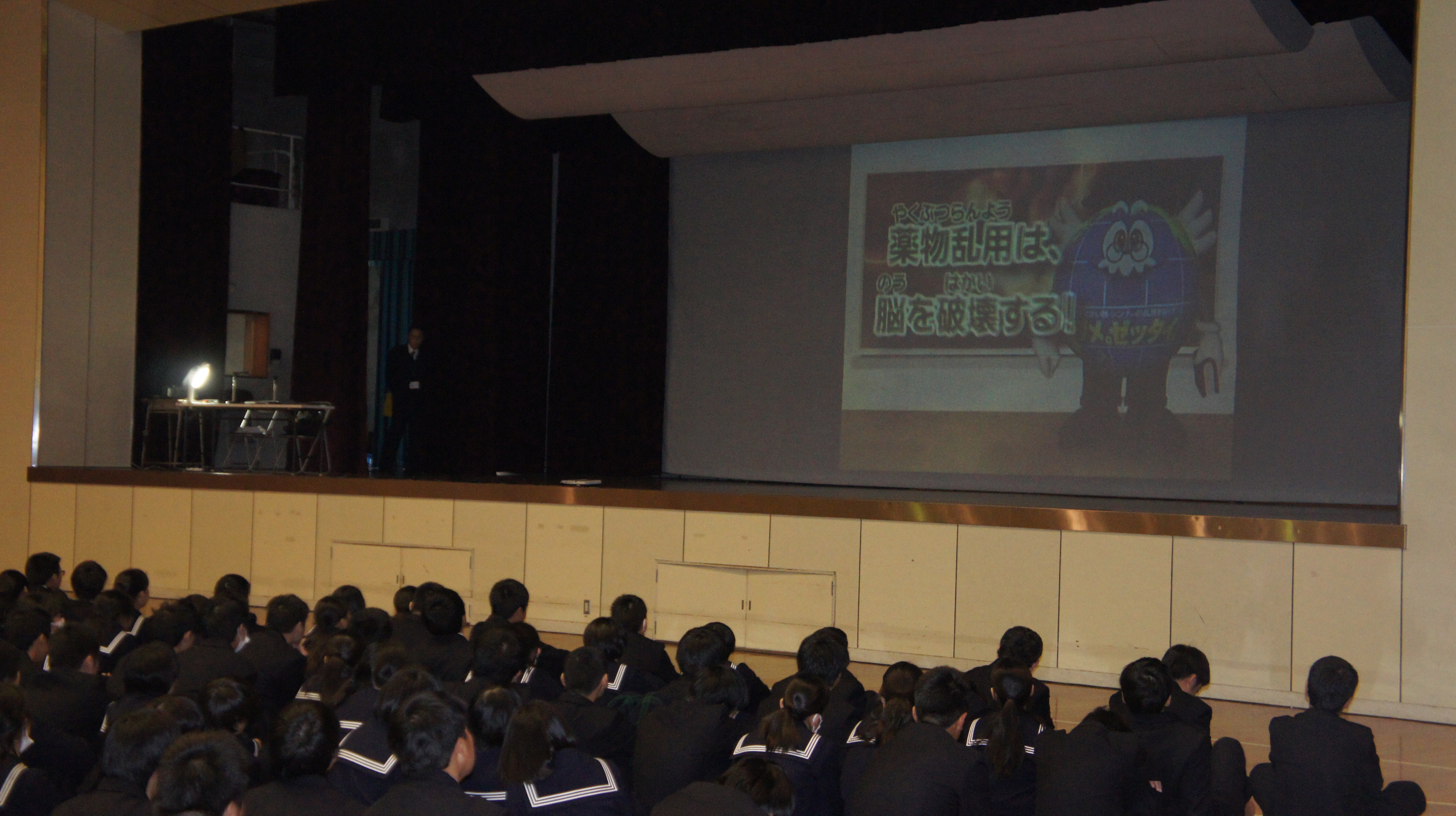 覚せい剤、シンナーなどの薬物の恐ろしさ、実際それが自分の身近に存在する危険を警告されました。また、生徒が関心の深い携帯電話、スマートフォンの使い方について、安易な書き込みによるトラブル、人権侵害、架空請求、損害賠償、犯罪となる事象など、映像を用いて解説していただき、よく理解できました。生徒たちは自分に身近な問題として興味深く聞き、有意義な時間となりました。