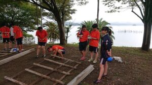 朝から雨が降っていたので予定を変更し、屋内でクラフト製作の体験をするグループと磯釣り体験をするグループに分かれて活動を行いました。クラフト体験では海辺に散らばっている貝殻やシーグラスなどを思い思いのデザインで組み立てました。磯釣り体験では、雨の中ですが、メバルやアイナメなど、まずまずの釣果をあげました。午後、雨が落ち着いてから、いかだ作りに取り組みました。説明を聞いただけではなかなか難しかったのですが、係の方に教えていただきながらみんなで協力し、何とか完成させることができました。明日いよいよこのいかだで海へと出航します。夕食はBBQでした。大勢でお肉を焼いて食べる雰囲気は、いつもと違って格別でした。仲間との距離も一段と近づいたことでしょう。また磯釣り体験で釣った魚も美味しくいただきました。
