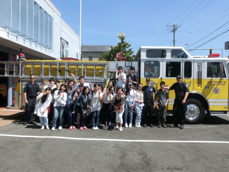 ②7月17日(金)午後のアクティビティで職場見学体験としてビクトリア市の消防署を見学させていただきました。消防車に乗車体験や、防護服を着用したり、させていただきました。