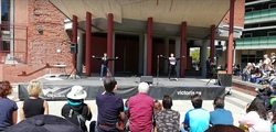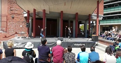 今日は、World Student Day ということで、授業は前半だけで、後半は市役所前の広場で行われたイベントに参加しました。ビクトリアの全語学学校の生徒が集まり、出身国のブースを出していたり、ステージで歌やダンスを披露したり、でとてもにぎやかでした。本校ダンス部の二人も飛び入りで出演させてもらい、大喝采を受けていました。踊り終わってからも、色々な人に「良かったよ」と声をかけてもらっていました。
