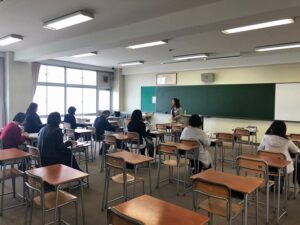 12月14日(土)育友会主催の進路ガイダンスが開催されました。参加者は75名、1部は講演会、2部は学校説明会を行いました。1部の講演会は、外部から講師をお招きして、「目的を持った進学とは・・・」をテーマにお話しいただきました。これからの大学進学に必要なこと、正しい進路選択について詳しく説明いただきました。2部の学校別説明会は、芦屋大学、近畿大学、関西外国語大学、大阪産業大学、大阪芸術大学、関西国際大学、神戸芸術工科大学、頌栄短期大学,京都外国語大学の8大学に来ていただき、説明を聞いて回れるよう各教室に分かれて対応していただきました。参加の皆さんは3つの大学のお話が聞けました。あわせて、本館廊下では大学・専門学校の資料配布会もおこなわれました。参加者の方々は、大学について多くを知ることができた。また、資料もたくさんもらえたと好評でありました。