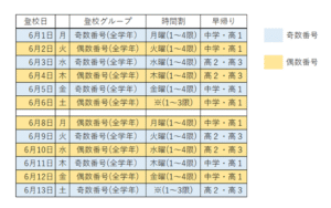 ◆登校日・早帰り(下の表が見にくい場合はこちらで確認⇒登校日ファイル)