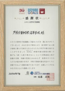 7月10日(金) 芦屋ユネスコ協会の 山中 健 会長から感謝状の贈呈を受けました。