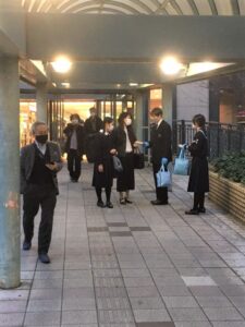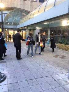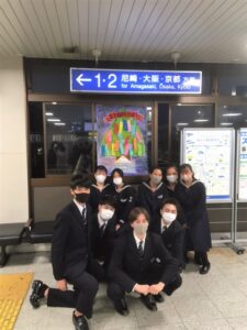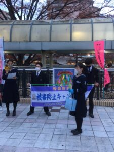 全校生に標語やメッセージの記入を依頼したところ、皆しっかりと考えて協力してくれました。生徒会執行部の9名が、11月27日(金)の夕刻、皆で書いた短冊と防犯協会が準備したスポンジをセットし、JR芦屋駅北のペデストリアンデッキ周辺で市民の方に配付させていただきました。初めのうちは恥ずかしさが勝ってしまい、呼びかけるのもしどろもどろでしたが、次第に元気に声をかけられるようになりました。配付終了後は、美術部の部員が描いたクリスマスツリーに、短冊を貼り付けたものをJR芦屋駅構内に晴らせていただきました。この画はクリスマスの日まで掲示してくださるそうなので、お立ち寄りの際は是非ご覧ください。