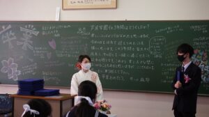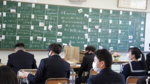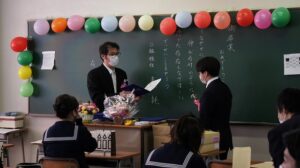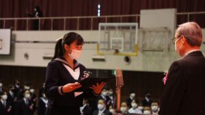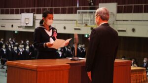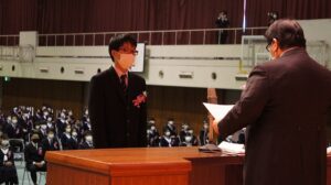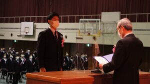 卒業証書は総代の澤村航輝君が受け取りました。校長先生の式辞では「高校生活で学んだことを是非、将来に役立てて欲しい。」との激励をいただきました。最後に卒業生を代表して山口愛音惟さんが「コロナ禍の中での1年間を振り返りながら、支えてくれた保護者・先生方、そして今日の日を迎えた友たちへの感謝の気持ちを忘れない。」と力強く挨拶を行いました。