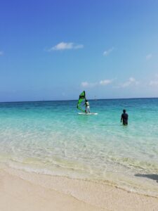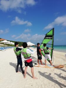 今日も朝から生徒たちは、様々なアクティビティに挑戦しました。ウィンドサーフィンは、まず砂の上で練習してから海へ。一発で風に乗れた者も、海へダイブした者も。そんな中でもミッションは忘れず、インストラクターの方とお話してお名前や出身地など色々教えていただいたようです。