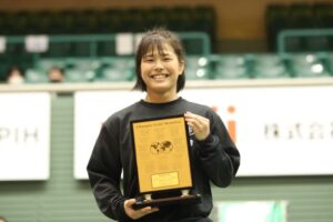 『49kg級は2019年世界カデット選手権43kg級優勝の原田渚(兵庫・芦屋学園高)が4試合中3試合に第1ピリオドのテクニカルフォール勝ち。決勝も7-0で勝って2大会連続、2018年中学生の部を含めて3大会連続優勝。優秀選手に与えられるJOC杯盾を受賞した。芦屋学園高からは、61kg級で2019年全国中学生選手権優勝の池畑菜々も勝った。』