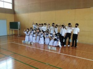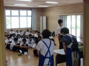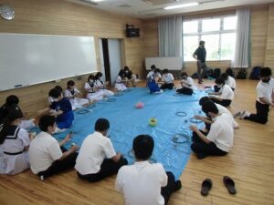 こんなひもみたいなものから、風鈴カバーを作りました。ベースになる部分は地元の方が作ってくださいましたが、つなぎ合わせて編んでいったり、目が粗くならないよう工夫したり、風鈴がちょうど隠れるような形に整えたりと想像以上に大変な作業でした。講師の先生に、色々と助けていただき全員が完成することができました。「もっと大きな作品を作ってみたい!!」と創作意欲に火が付いた生徒もいました。本当にありがとうございました。