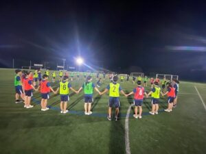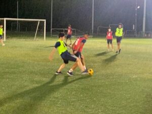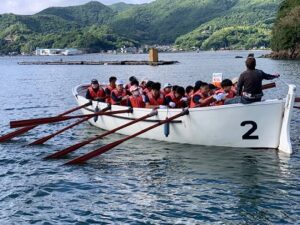 クレセントビーチで、ライフジャケットを着こんでカッター訓練です。3日目にレースがあるので練習に打ち込みました。その後、宿舎に戻り夕食後は、サッカーの試合で体を動かしました。