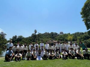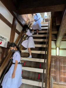 本日は、学校を予定通り出発し、先ずは彦根城見学。事前に知らせていたとはいえ、予想以上に急な石段を登りました。この時点で根を上げる生徒も数名。励まし励ましお城に到着。お城の中も傾斜のキツイ階段が続きます。登城しきった最上階から見る景色は絶景でした。