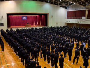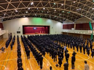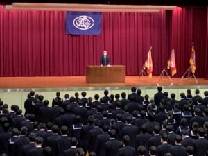 本日、体育館兼講堂で中・高全校生を集めて、令和4年度修了式と離任式が行われました。