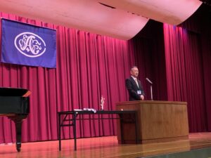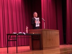 新任の教員の紹介の後、始業式で、磯村校長は、自己紹介と「使命」についてをテーマにした講話をされました。
