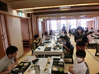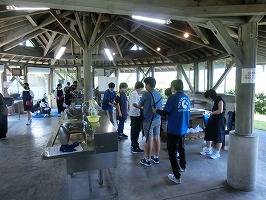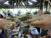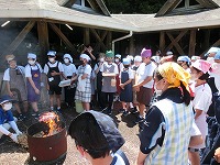 朝ご飯をモリモリ食べて、午前中は、まぜのおかでのカツオのたたき作り体験です。普段料理のお手伝いをしない人も一生懸命説明を聞いて、焼いたり、切ったり、盛り付けしたりと頑張りました。