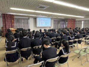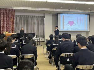 高校の方では「オーバードーズ」をテーマにお話いただきました。山田先生が強くお話されていたのは、「たとえ一度の乱用でも脳がダメージを受ければもう戻ることはない」ということと、「自分や自分のことを大切に思う人のこと、自分自身の夢を考えて、乱用に手を出さない、誰かに相談できる自分になろう」ということでした。最後の教頭先生からのお話で10代の市販薬の乱用が増えている現状を鑑み、断る勇気を持つことの大切さについて再確認できました。