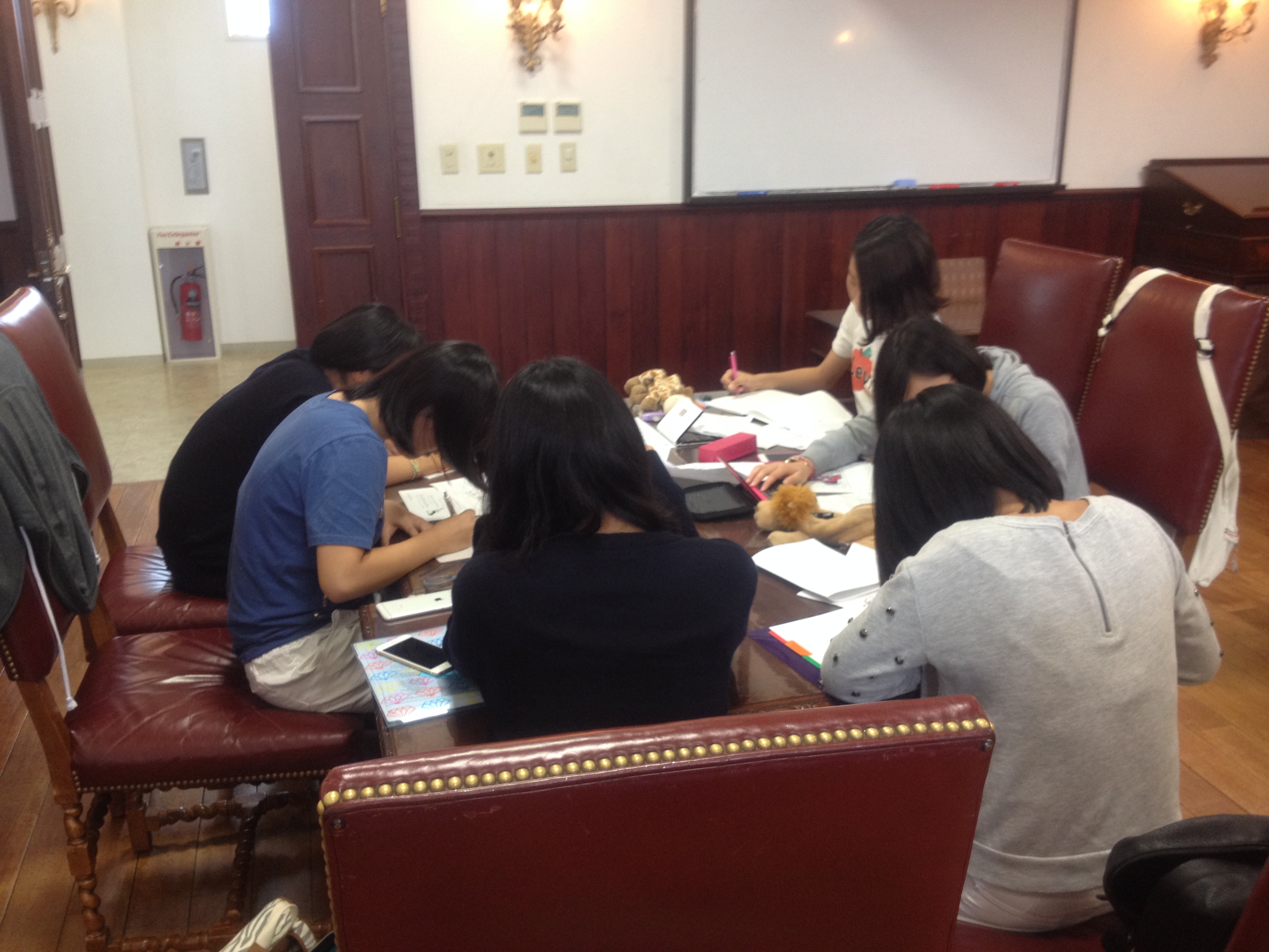 今日も、Discussion と Speech の授業を受け、Speech の授業では全員がスピーチを発表しました。写真は、休み時間に一生懸命にスピーチの仕上げをしているところです。