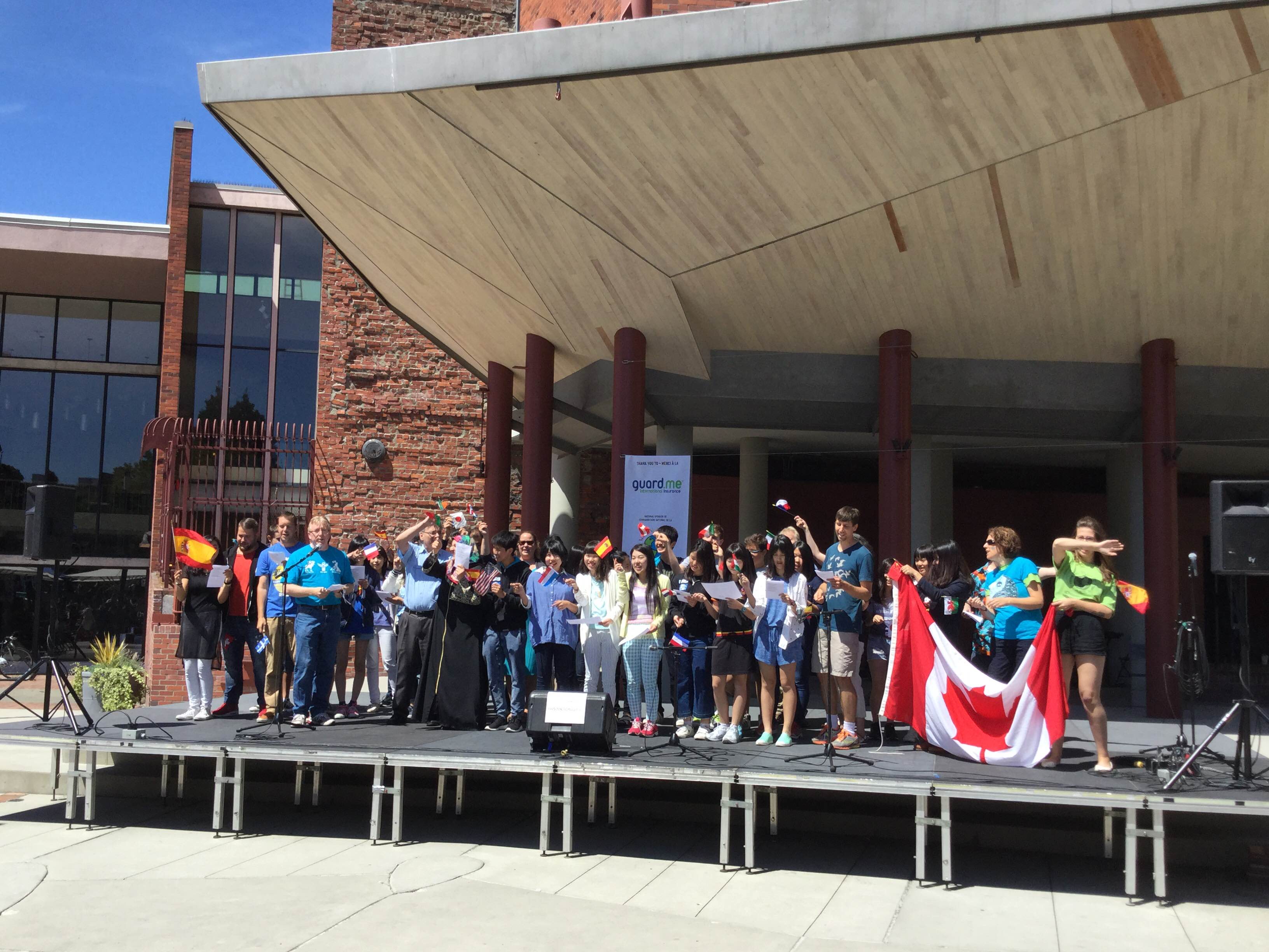 今日、7月15日はWorld Student Day ということで、ビクトリアにたくさんある語学学校から学生たちが市役所前の広場に集まりました。芦屋学園の生徒も、午前中、前半の授業を終えると、後半は広場に移動し、各国の学生が自国の歌やダンスを披露するのを楽しみました。芦屋学園の生徒のうち、Stewart College に通う生徒は舞台にも立ち、先生たちや仲間たちと歌を歌いました。