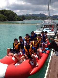 中学 高校 Topics J3A 沖縄修学旅行だより その3 2016.07.23 三日目は、アクティビティ。シュノーケリングでニモとその仲間に遭遇。美しい珊瑚の海を楽しみました。続いてバナナボードは爽やかな風が爽快。BBQでお腹いっぱいになった後は、カヌー体験。思ったよりも沖まで漕ぎ、太平洋を背に皆で記念撮影。早いもので、明日は沖縄最後になりました。