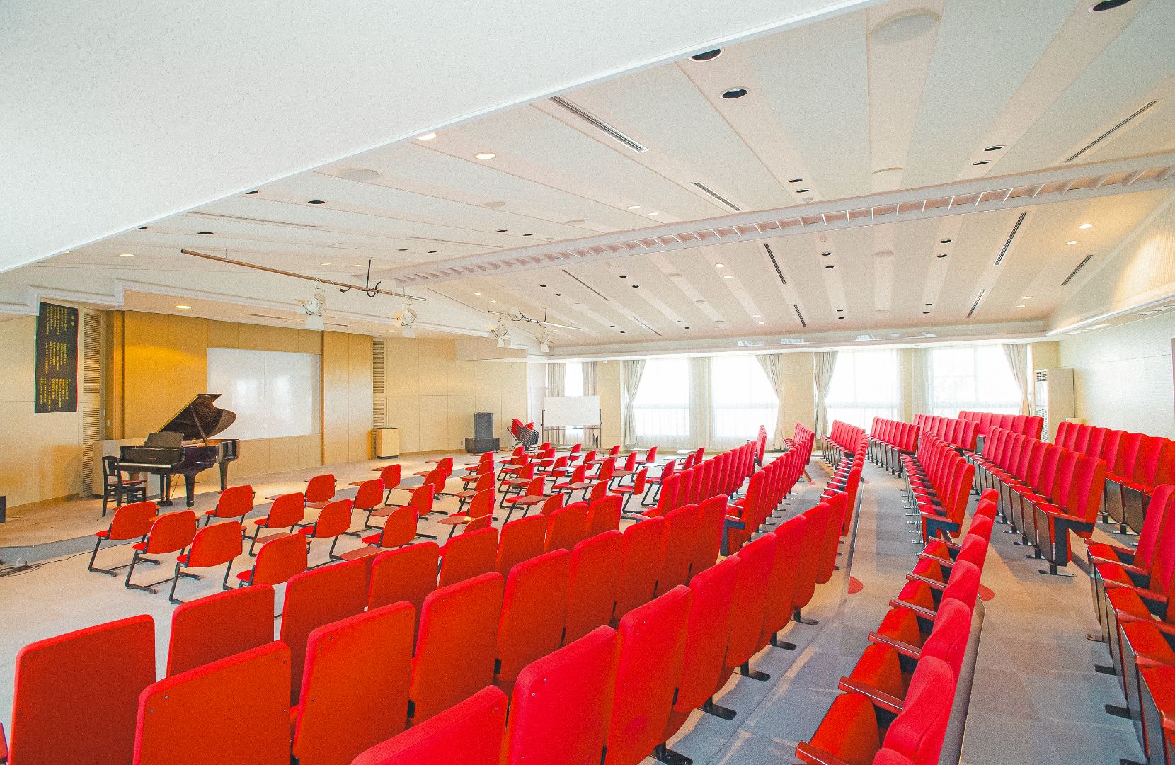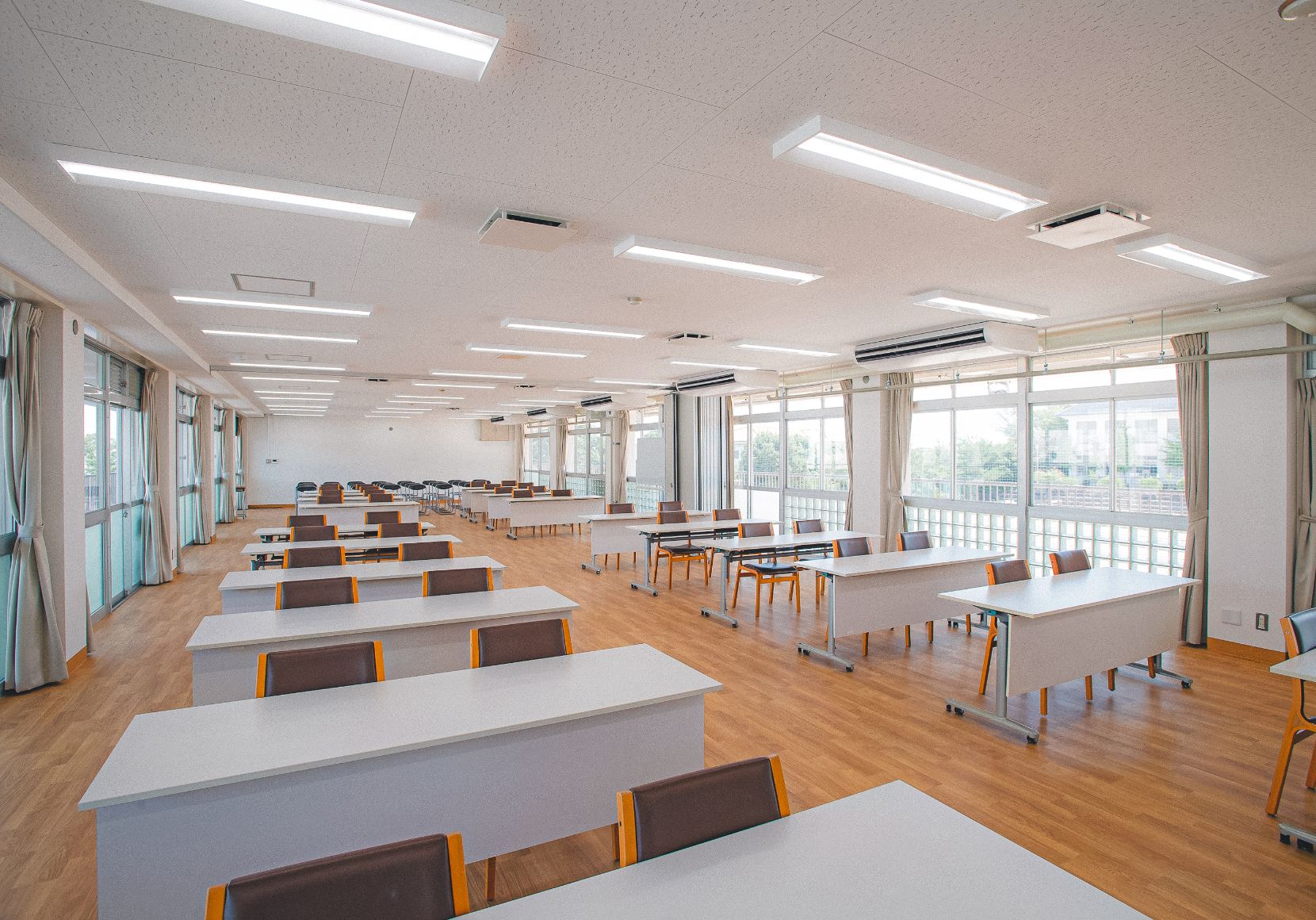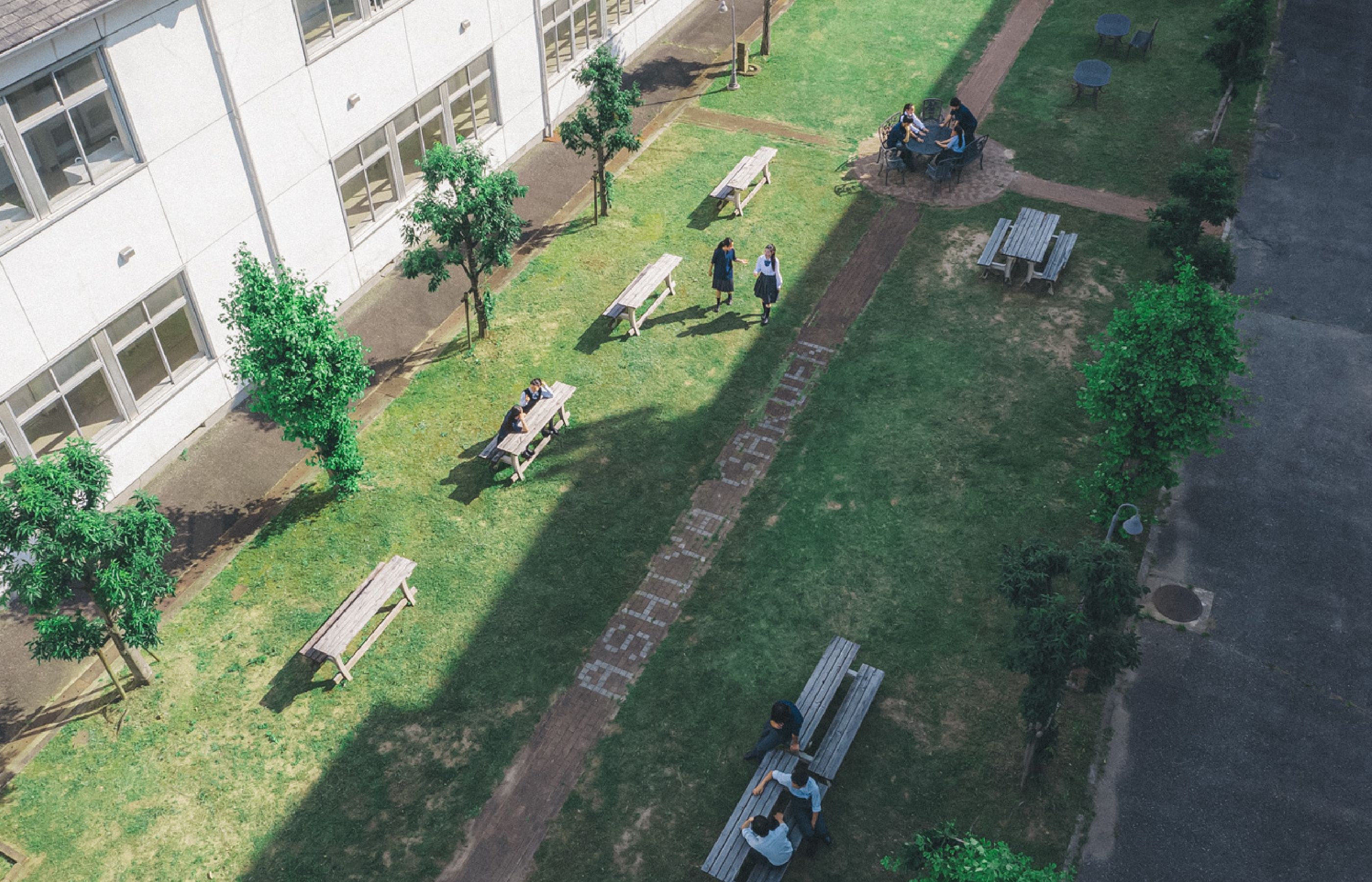 TOPスクールライフ施設紹介 施設紹介 緑と笑顔あふれる 白いキャンパス Facility Movie PLAY 音楽ホール 中央ロビー 第1体育館 テニスコート 多目的教室 憩いの広場 ランチルーム 図書室 スクールライフ 制服紹介 年間行事 アシハピ